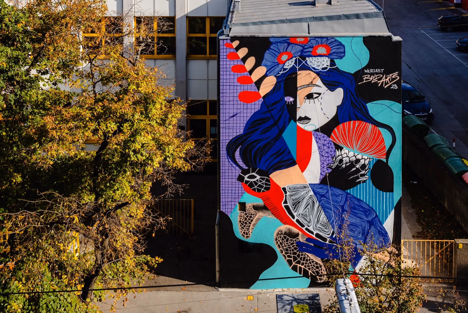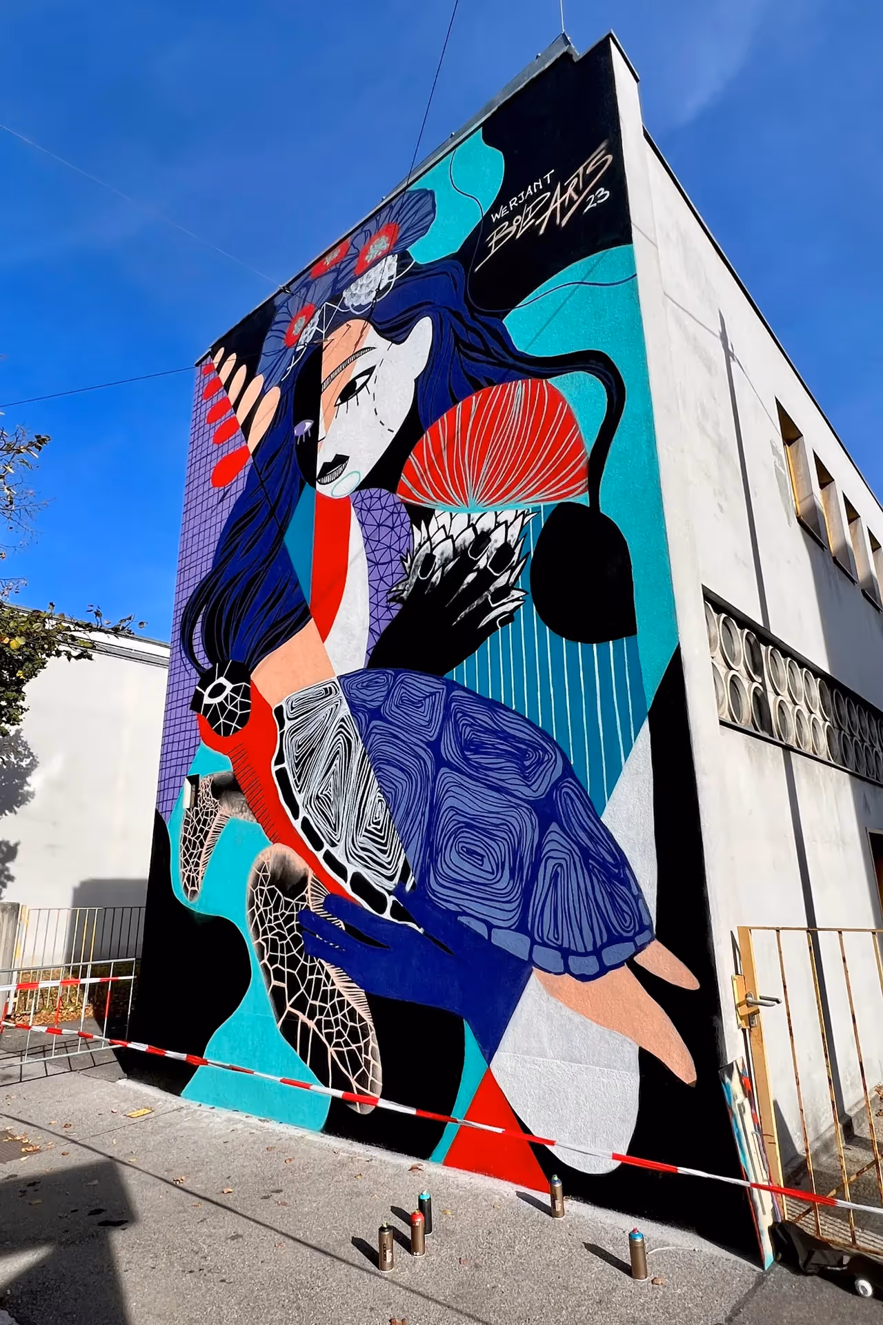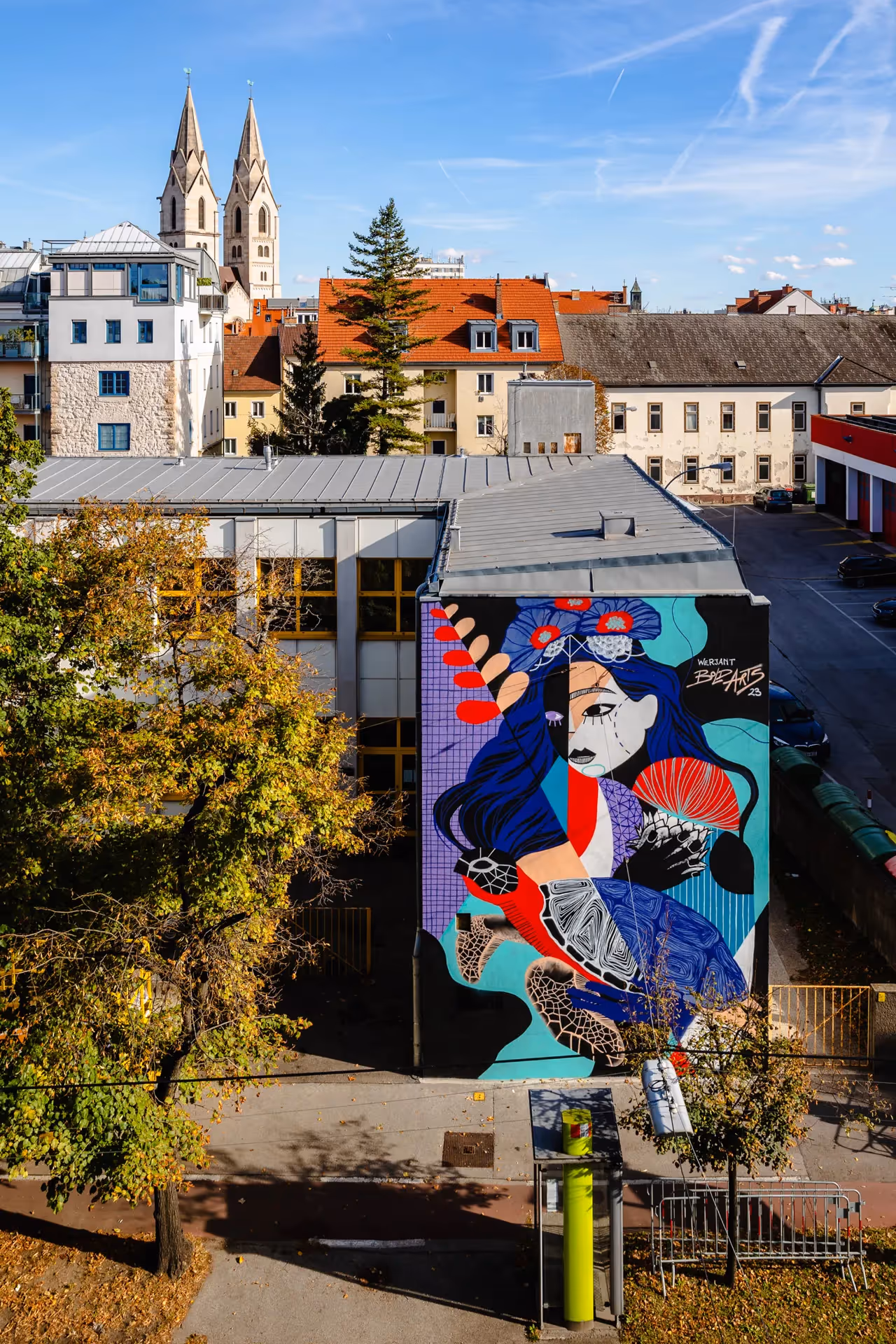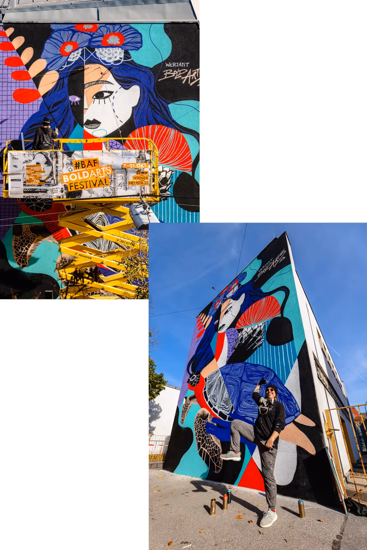 Für das Bold Arts Festival in Wr. Neustadt hatte ich die Ehre, eine großartige Wand direkt am Barbenbergerring zu gestalten. Inspiriert vom Wahrzeichen der Stadt, dem Wasserturm, und der mythischen Figur des Wassermanns, auch bekannt als „Aquarius“ auf Latein oder „Hydrochóos“ auf Griechisch, bietet mein Wandbild eine zeitgenössische Interpretation. Das Konzept dreht sich um eine moderne Unterwassergöttin und die Bedeutung von Wasser als Quelle des Lebens, der Kreativität und der Inspiration.