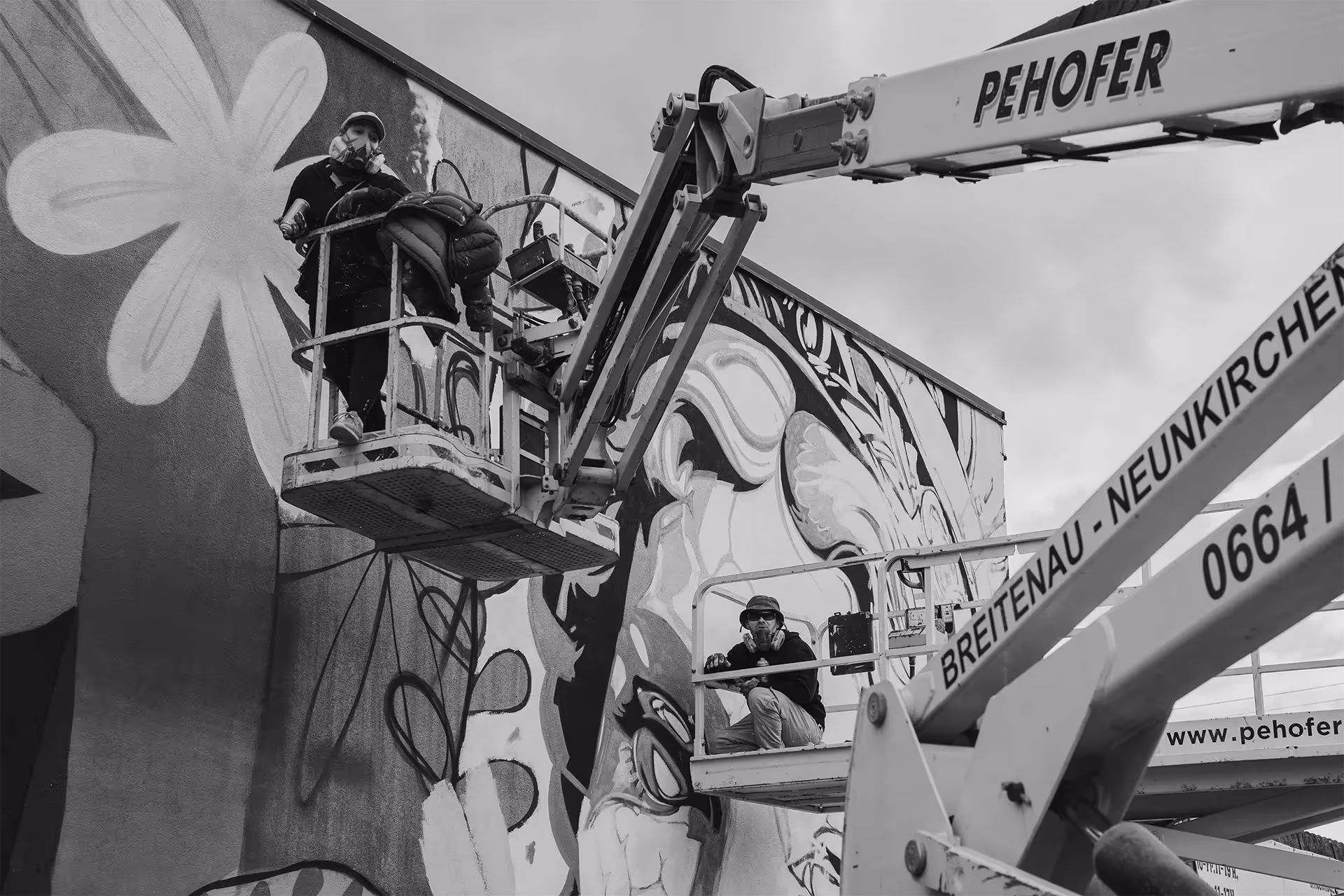 Im Oktober 2024 habe ich im Rahmen des Bold Art Festivals in Wiener Neustadt dieses großflächige Wandgemälde gemeinsam mit Crazy Mister Sketch (linke Wand), 37 und Mike Hotel (die beiden Skulpturenköpfe) umgesetzt. Das Projekt verbindet verschiedene künstlerische Handschriften: von surrealen Farbwelten über abstrakte Figuren bis hin zu klassischen Skulpturporträts in neuem Licht. Die Komposition spannt den Bogen zwischen Tradition und Urban Art und bringt so unterschiedliche Stilrichtungen in einen harmonischen Dialog.