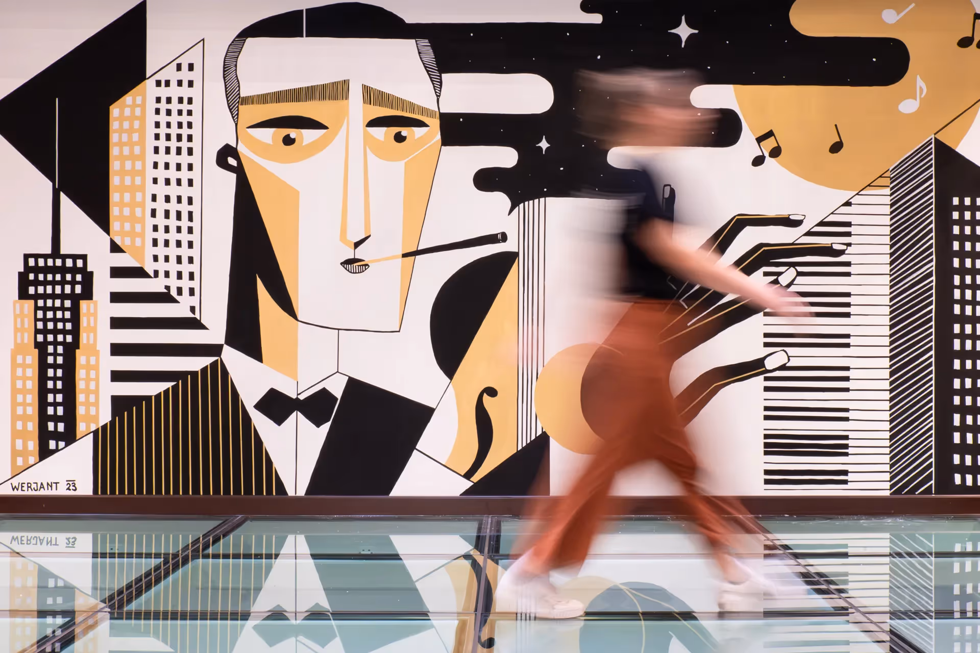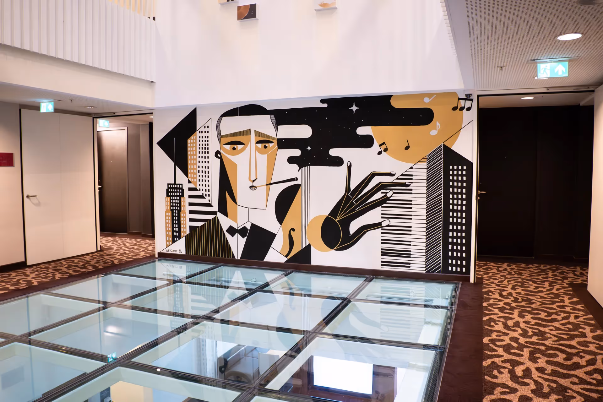 Im Sommer 2023 wurde ich von velvenoir beauftragt, ein Wandgemälde für das Crowne Plaza Amsterdam South Hotel zu gestalten. Dieses Wandgemälde huldigt dem zeitlosen Erbe von George Gershwin, indem es nahtlos die Essenz von New York City, die faszinierende Welt des Jazz und die künstlerischen Bewegungen, die die 1920er Jahre prägten, miteinander verwebt. Inspiriert von Kubismus und dem Surrealismus der Epoche zeigt das Wandgemälde Gershwin am Klavier vor einer traumhaften, abstrahierten Skyline von New York. Die Farbpalette aus Schwarz, Weiß und Gold, die an die Art-Deco-Bewegung erinnert, verleiht der Komposition eine Aura von Eleganz und Raffinesse. Diese Farben, die die Kunstfertigkeit des frühen 20. Jahrhunderts widerspiegeln, symbolisieren den kulturellen Reichtum und die Opulenz der Epoche. Das Wandgemälde, das sich im Crowne Plaza Amsterdam South befindet, das an der Gerschwinlaan liegt, stellt eine klare Verbindung zum Geist von New York, Gershwin selbst und der lebendigen Energie seiner Zeit her.