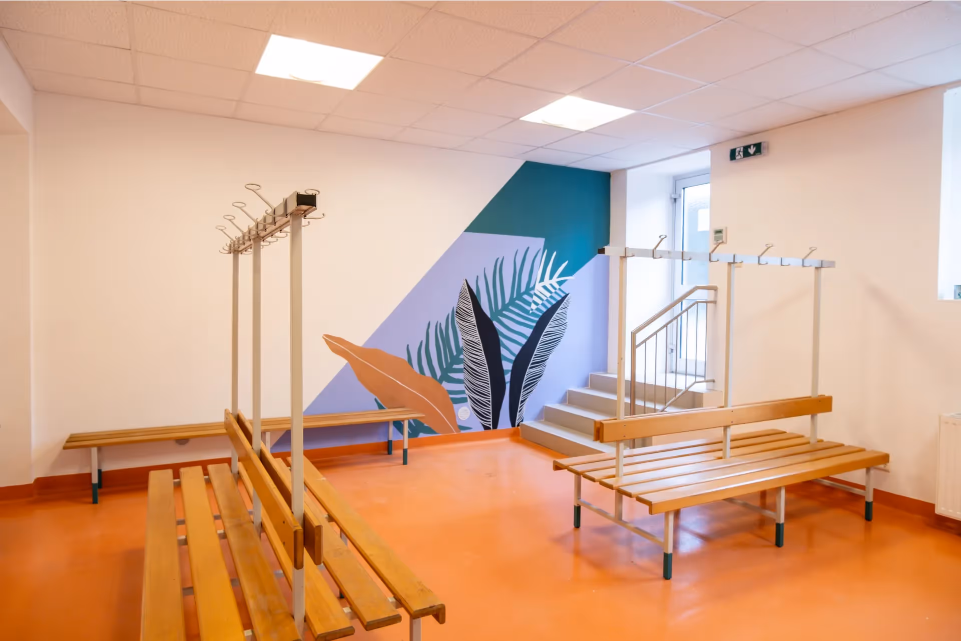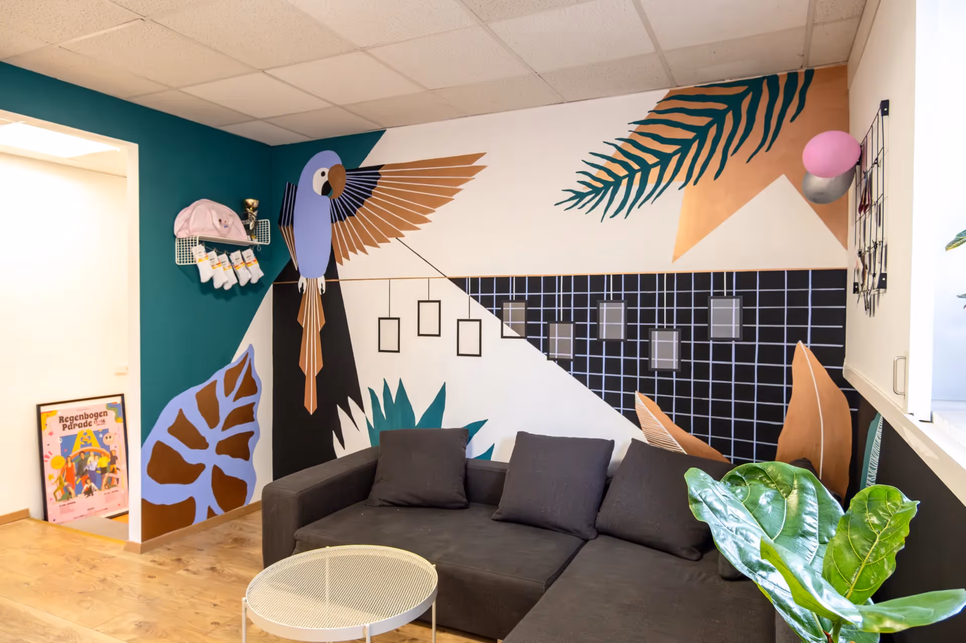 Für das Hiporama Tanzstudio, das zur Arriola Association gehört, habe ich ein Dschungel-Thema aufgegriffen. Aufgrund der niedrigen Decken habe ich mehrere kleinere Elemente in den Räumlichkeiten verteilt. Die Designs zeichnen sich durch satte Dunkelgrüntöne in Kombination mit lebendigen Flieder aus, die durch einen Hauch von echtem Gold akzentuiert werden. Inmitten der Flora und Fauna des Dschungels sitzt ein majestätischer Papagei und verleiht dem Raum eine verspielte Note.