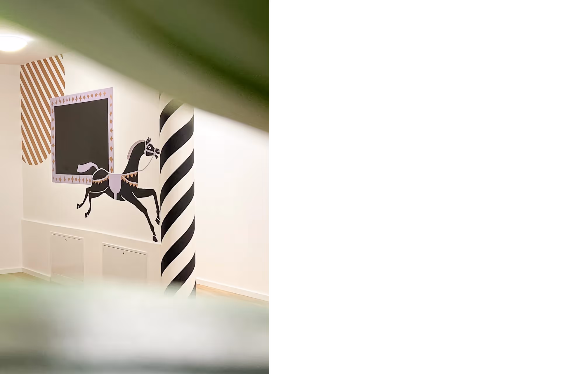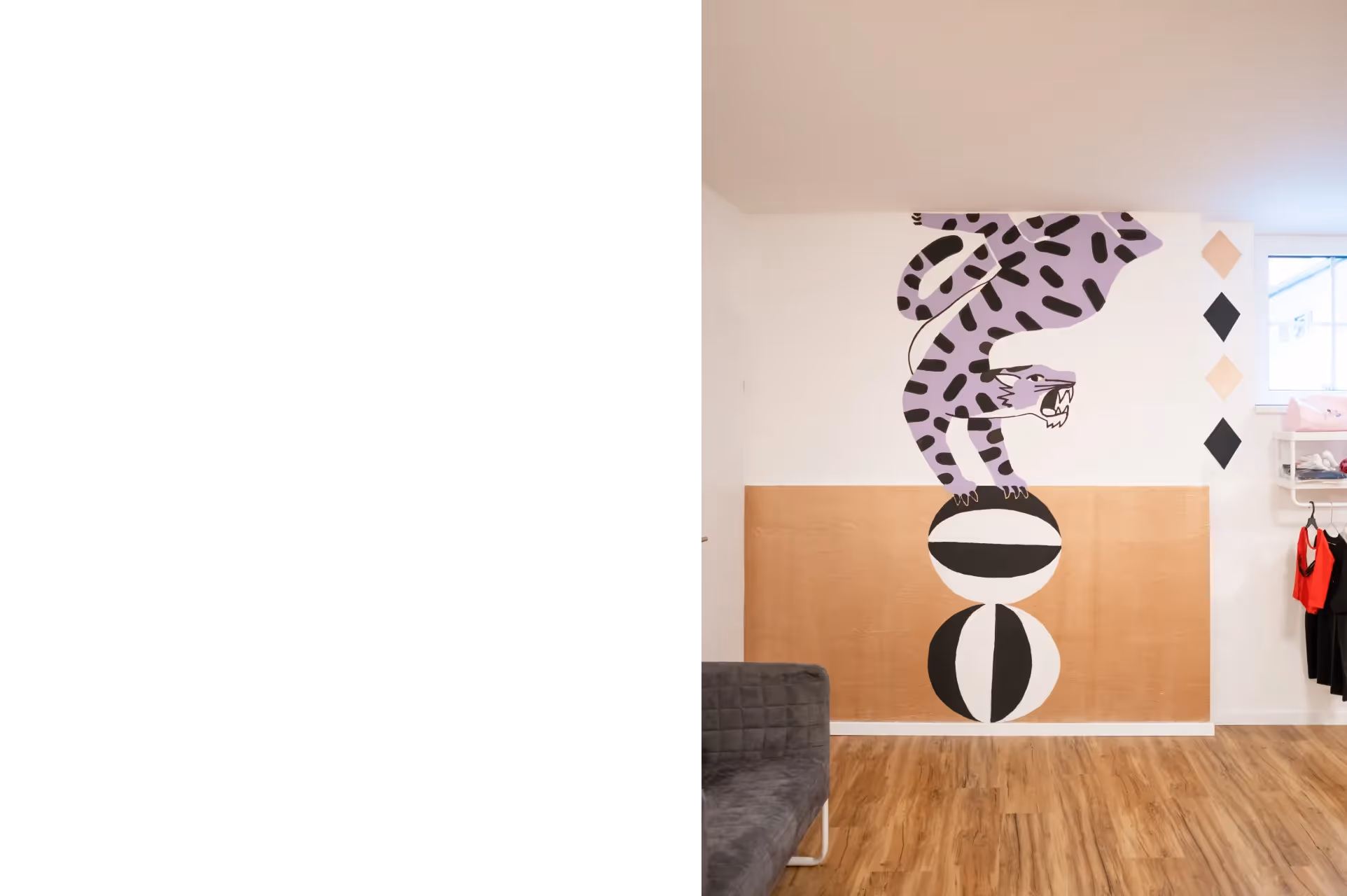 Für das Leorama Tanzstudio in Wien, das zur Arriola Association gehört, habe ich mehrere Elemente entworfen, die die gesamten Räumlichkeiten in einen Zirkus verwandeln. Angesichts der niedrigen Decken des Studios entschied ich mich dafür, mehrere kleinere Elemente im Raum zu verteilen, damit insgesamt ein luftiges Gefühl bleibt. Inspiriert von der Nähe zur berühmten „Zirkusgasse“ in Wien, griff das Wandbild das Zirkusthema auf, aber behielt sich mit der reduzierten Farbpalette eine gewisse Eleganz.