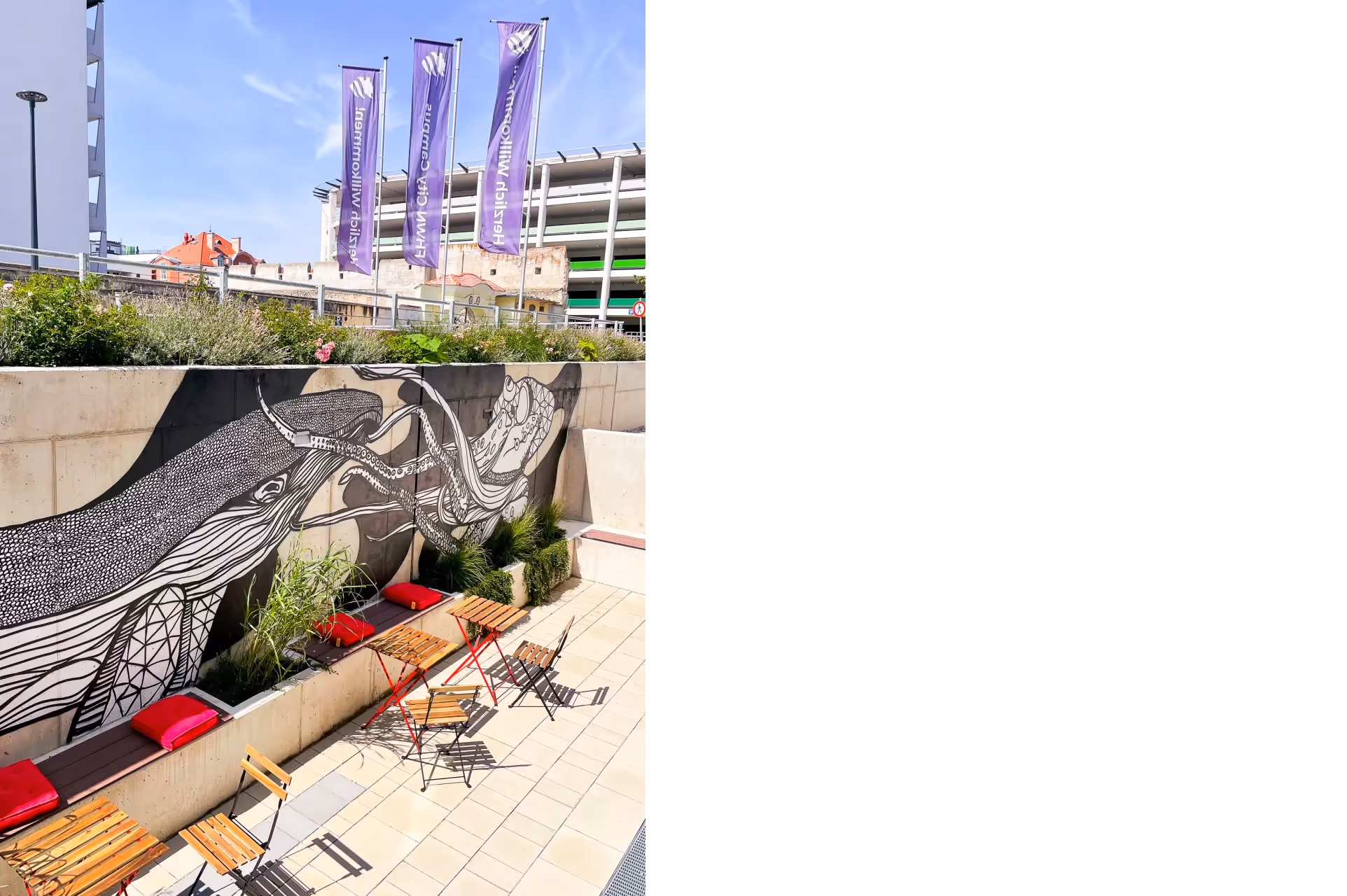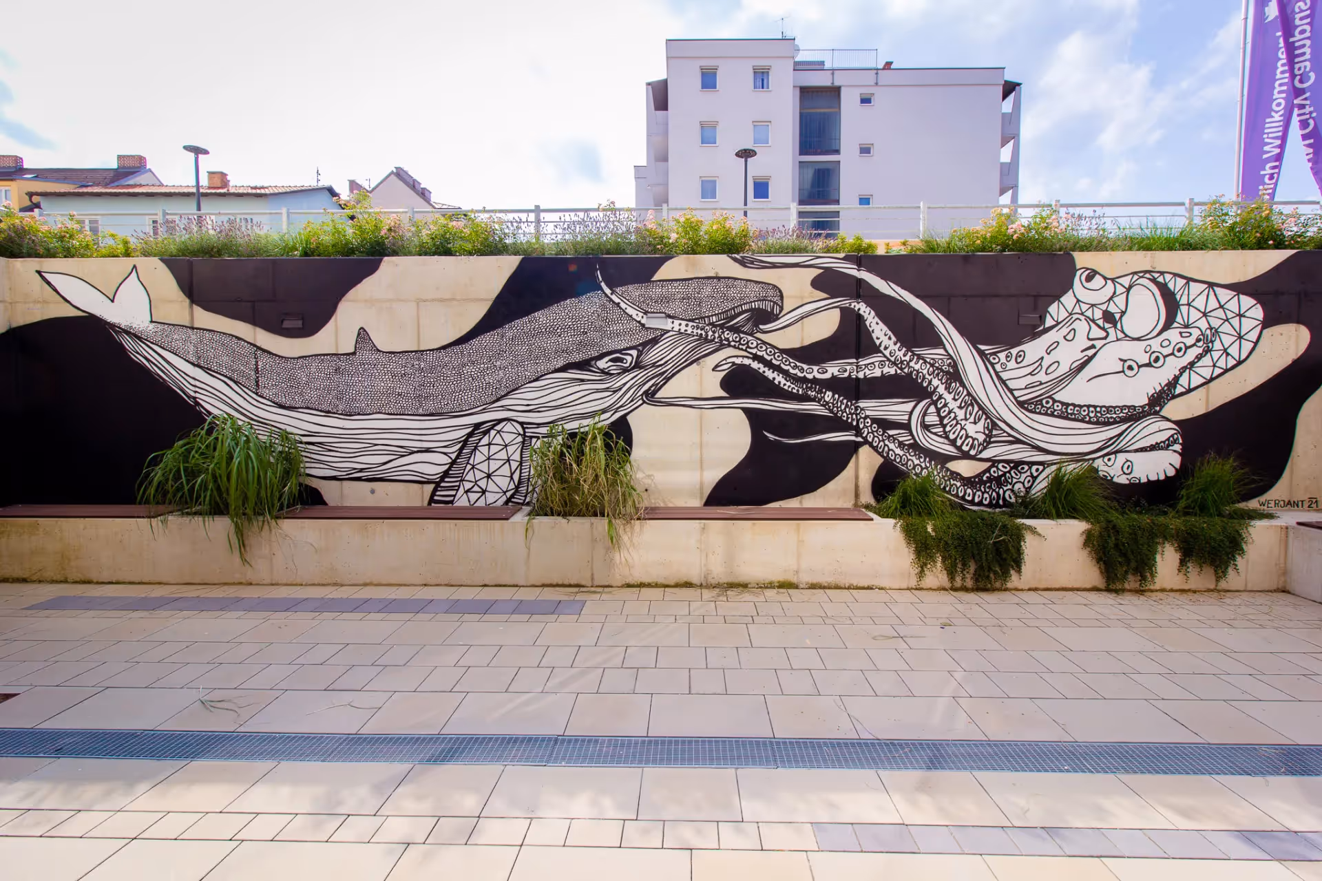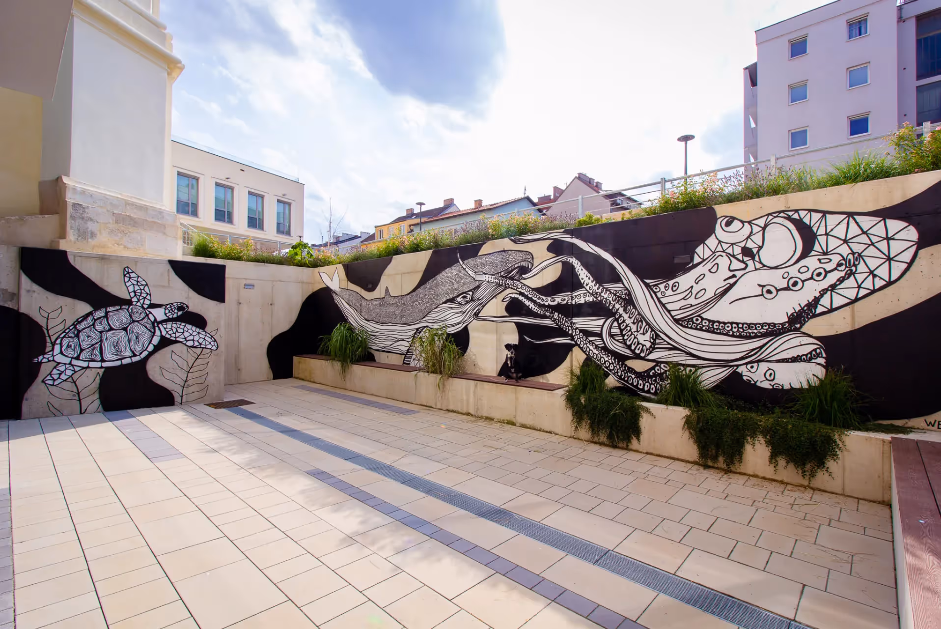 The library at the University of Applied Sciences Wr. Neustadt, aimed to transform an outdoor concrete space into an oasis for students. Dubbed the "aquarium," the space begged for an underwater theme that would entice students to linger. The mural features majestic sea creatures, including a whale and a towering kraken, dominating the main wall, while a friendly sea turtle adorns a smaller wall nearby.