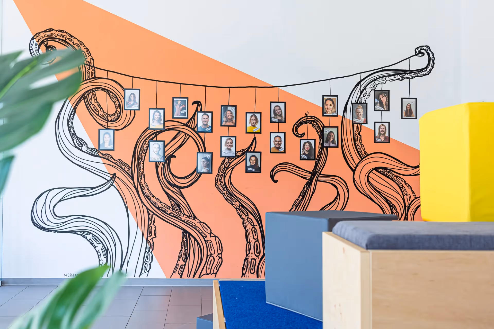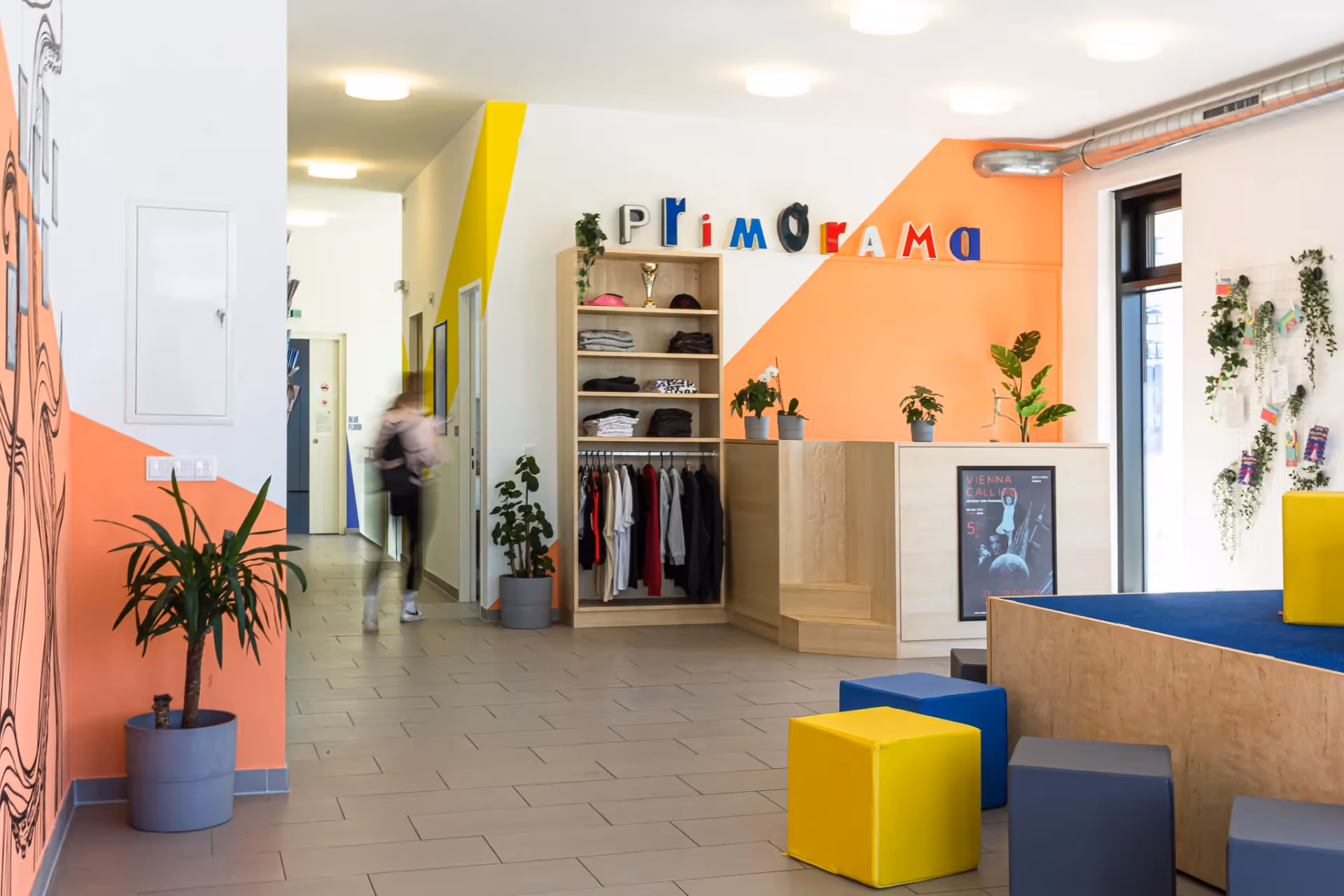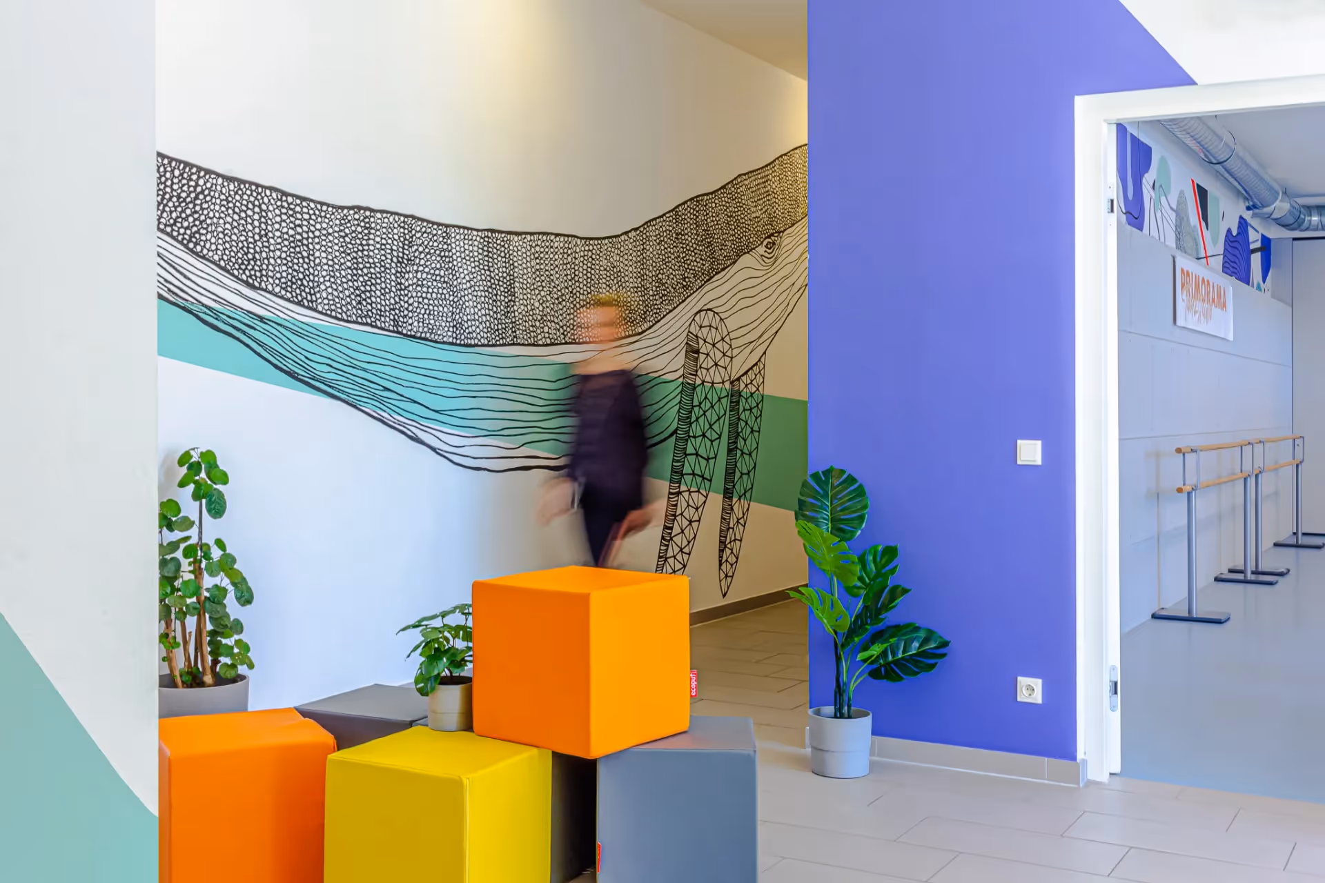 For Primorama Dancestudio, part of the Arriola Association, I crafted a vibrant mural project to infuse the space with color and personality. As visitors move through the space, they encounter a dynamic interplay of orange, blue, turquise and yellow, guiding them to each corresponding floor. Additionally, two striking murals featuring underwater scenes - a kraken and two whales - evoke the fluidity and beauty of dance, enhancing the studio's ambiance and inspiring creativity among its patrons. I partnered up with Lieb & Kühn Interior Design for this project.