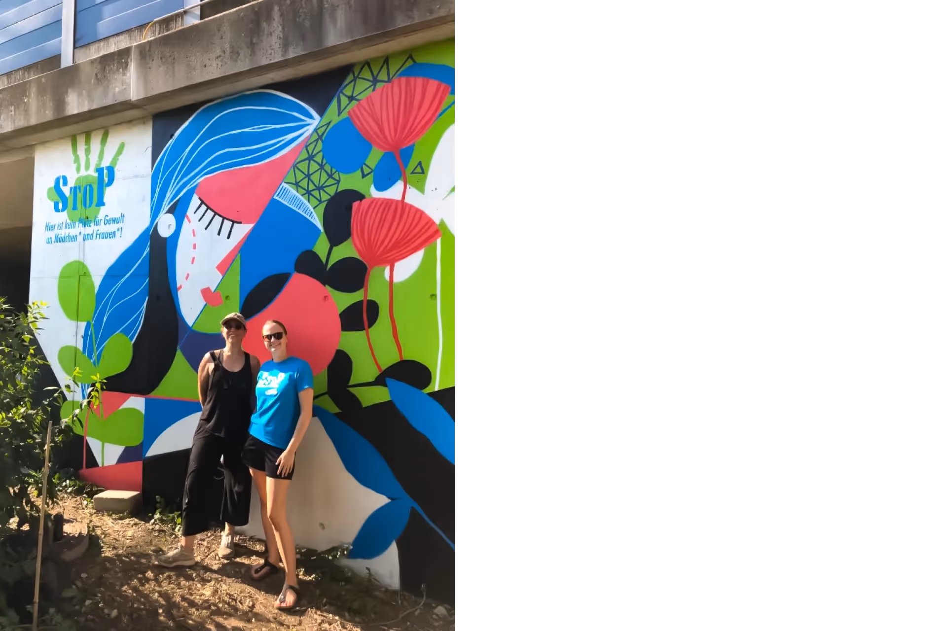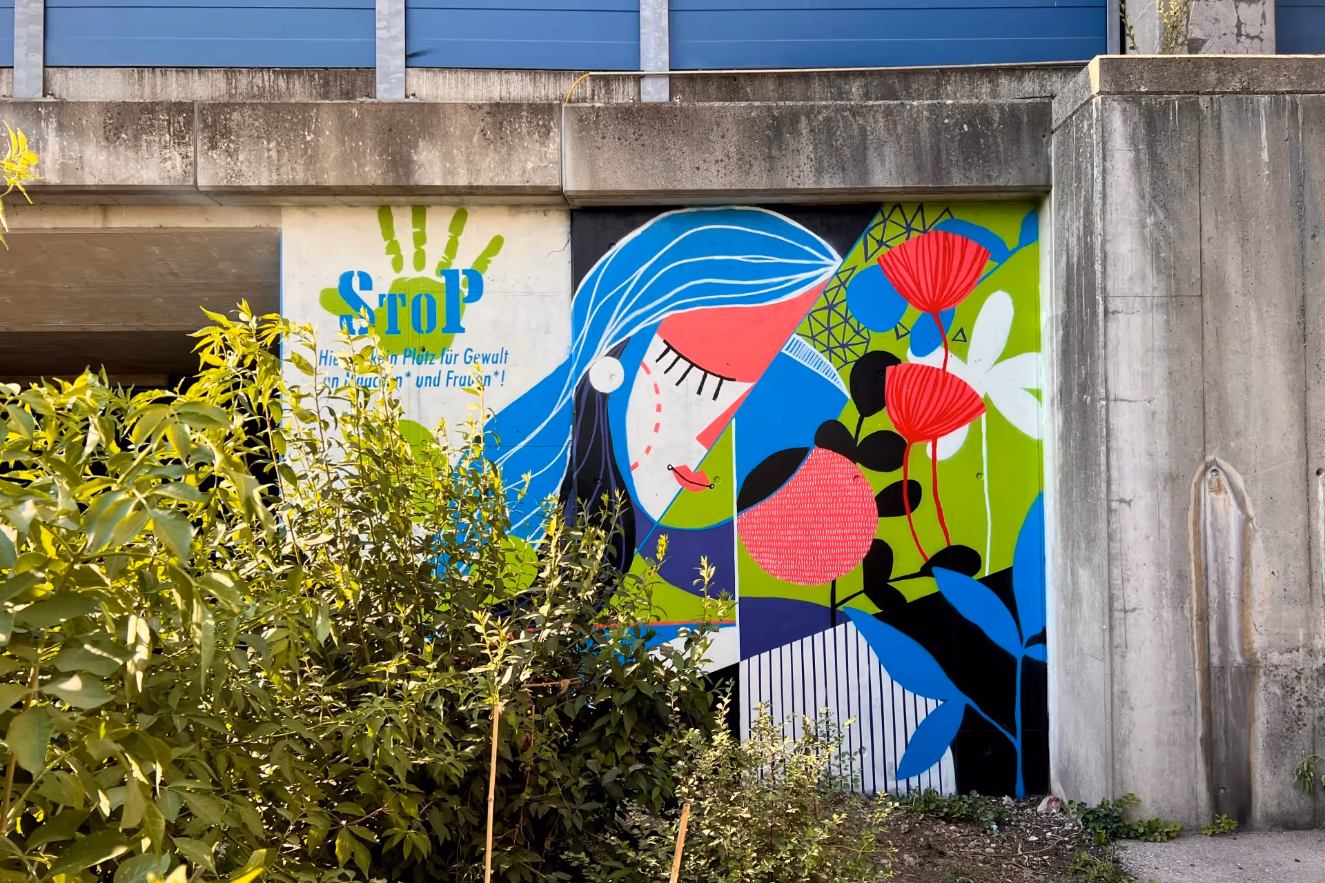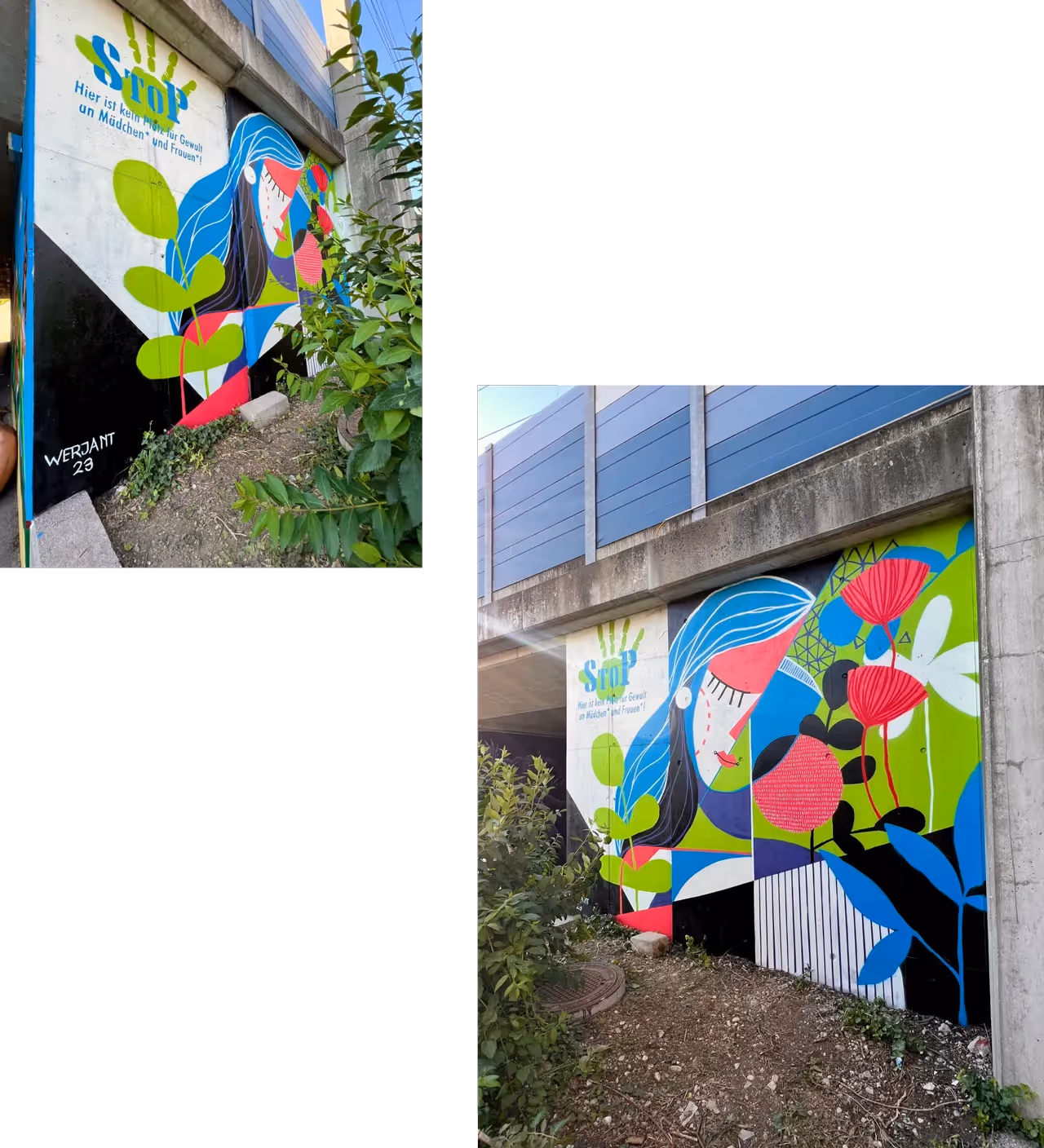I had the privilege of creating a mural to support the initiative "StoP - Stadtteile ohne Partnergewalt" (Neighborhoods without Partner Violence) in Amstetten, Lower Austria. The vibrant artwork depicts a female figure emerging from painful structures, blossoming and finding inner peace in the colors of the initiative. It was important for me to convey a positive and empowering message for women and girls experiencing violence in partnerships, offering courage for a colorful and hopeful future.