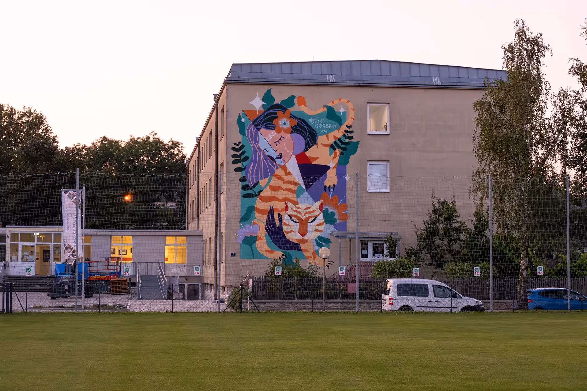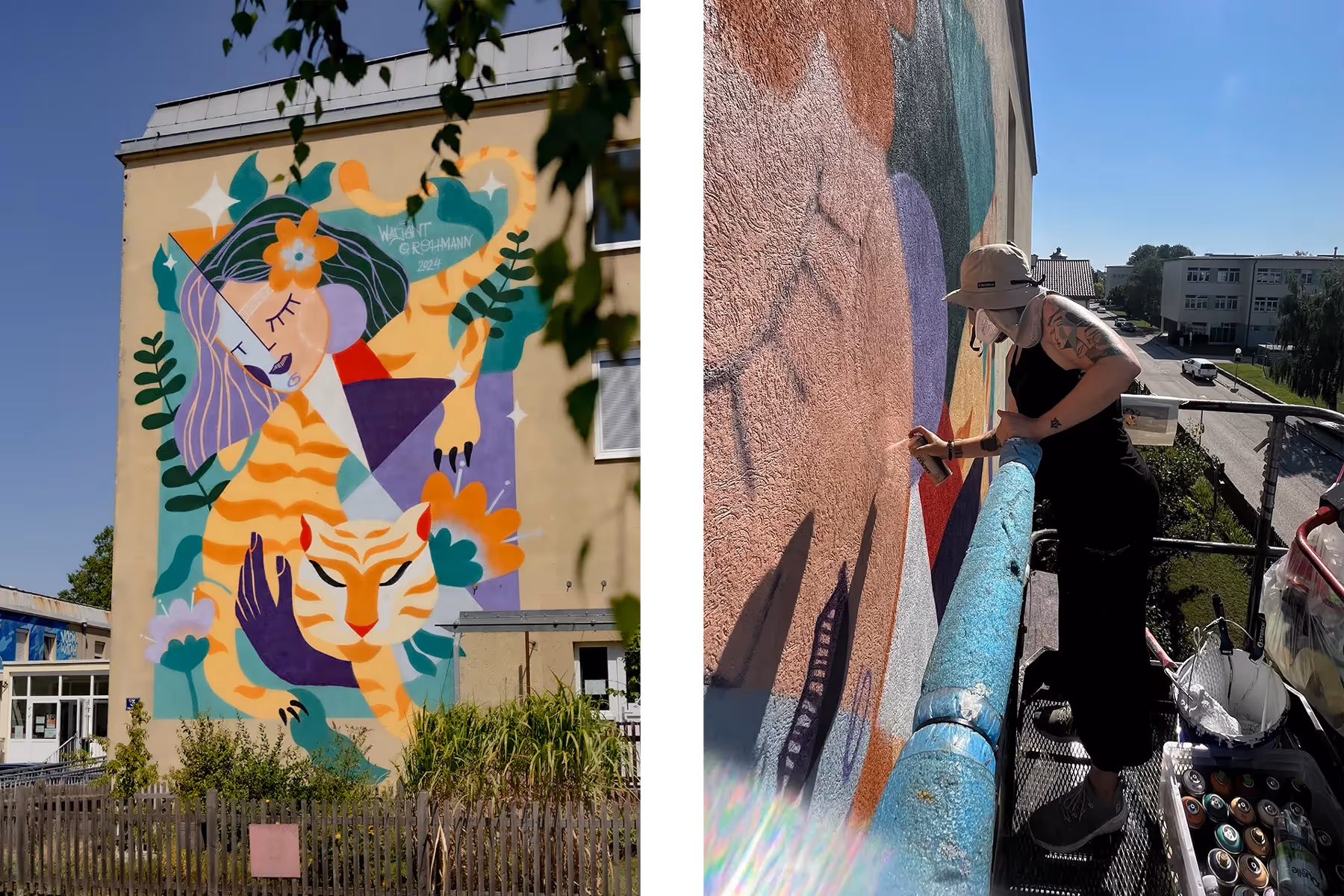 In 2024, I teamed up again with illustrator Anja Grohmann to create a large-scale mural for the Urban Art Festival in Amstetten. We combined my signature female character with Anja’s tiger, symbolizing connection, strength, and warmth. The mural was designed to bring color and positive energy to a building housing a women’s education center and a children’s crisis center.