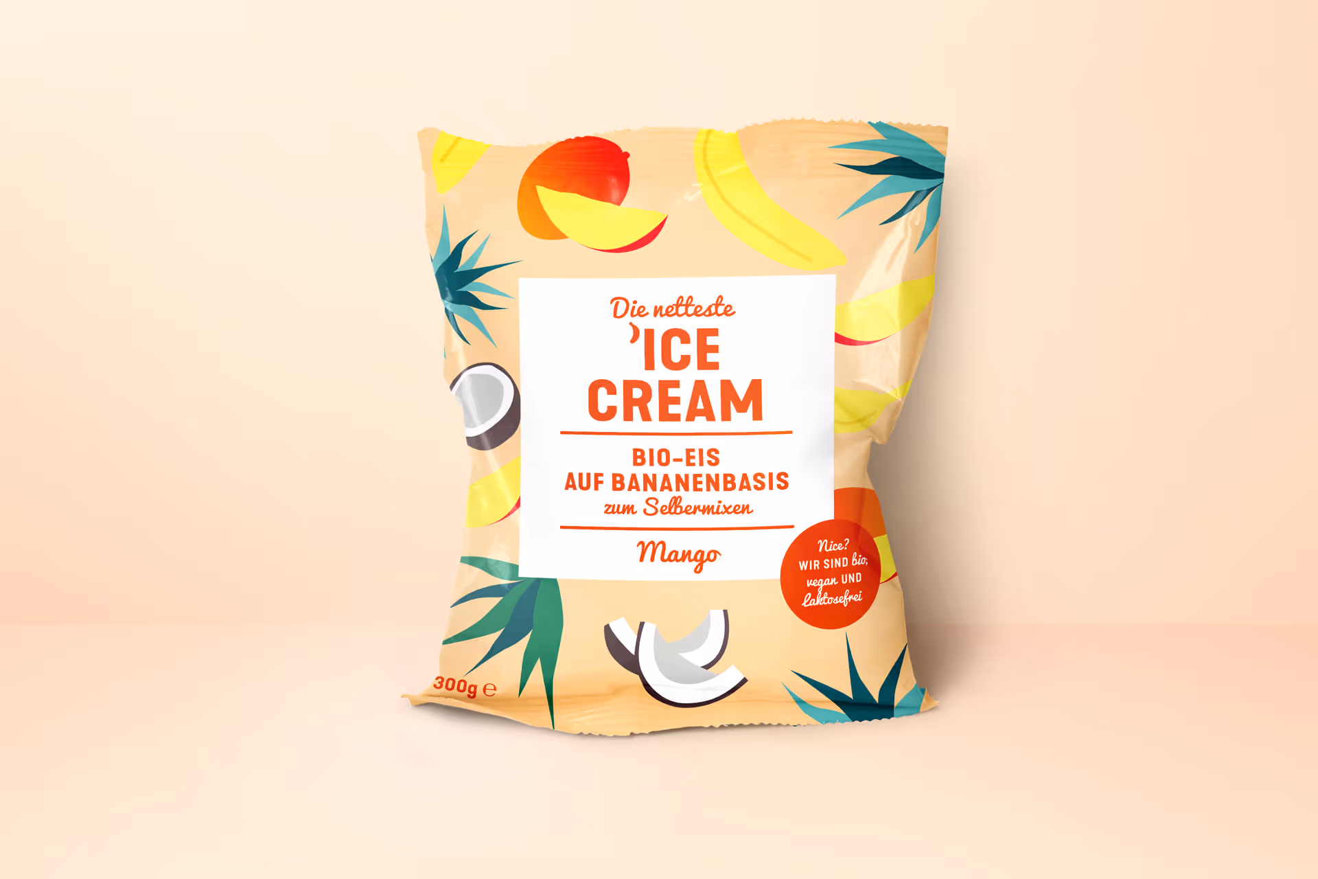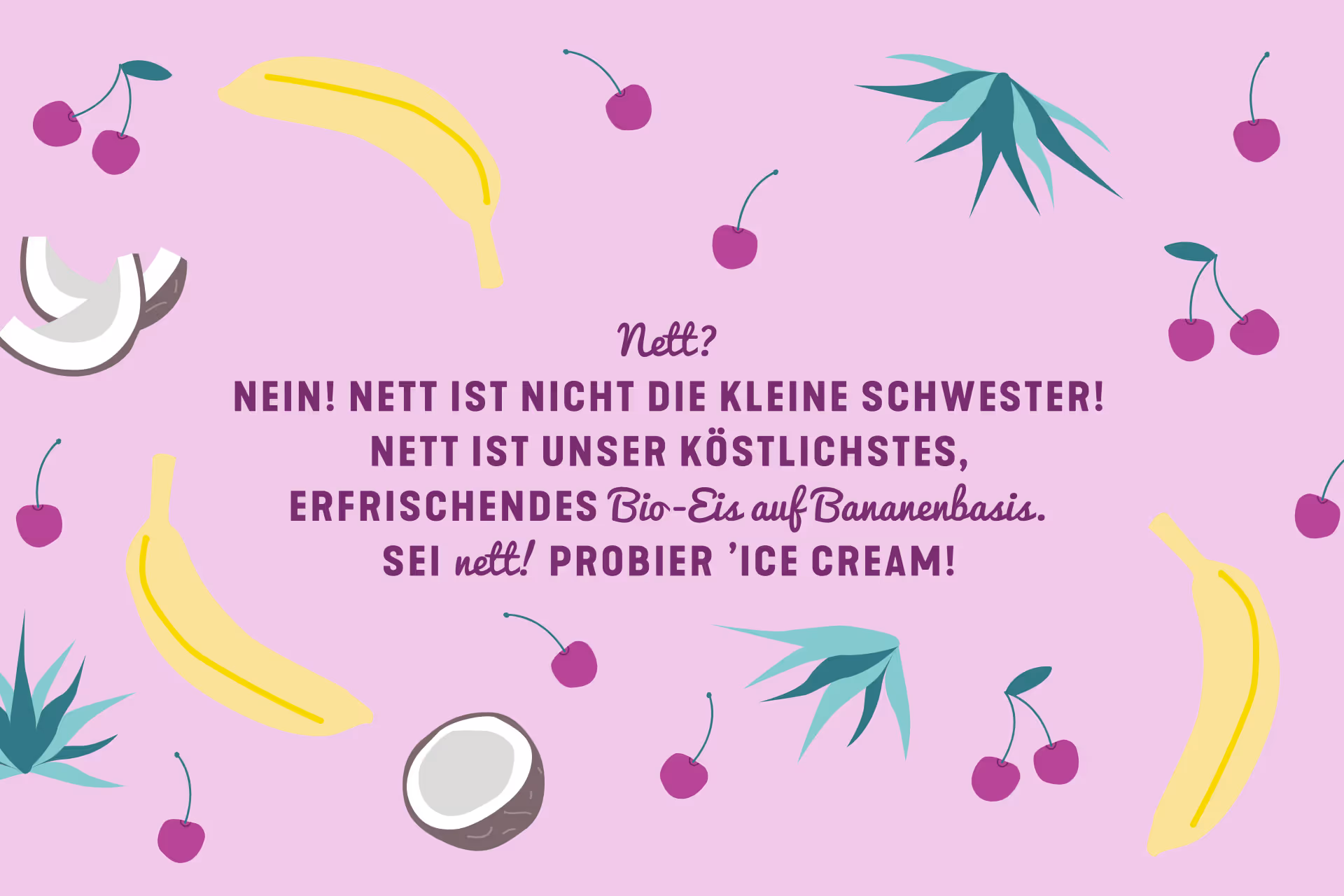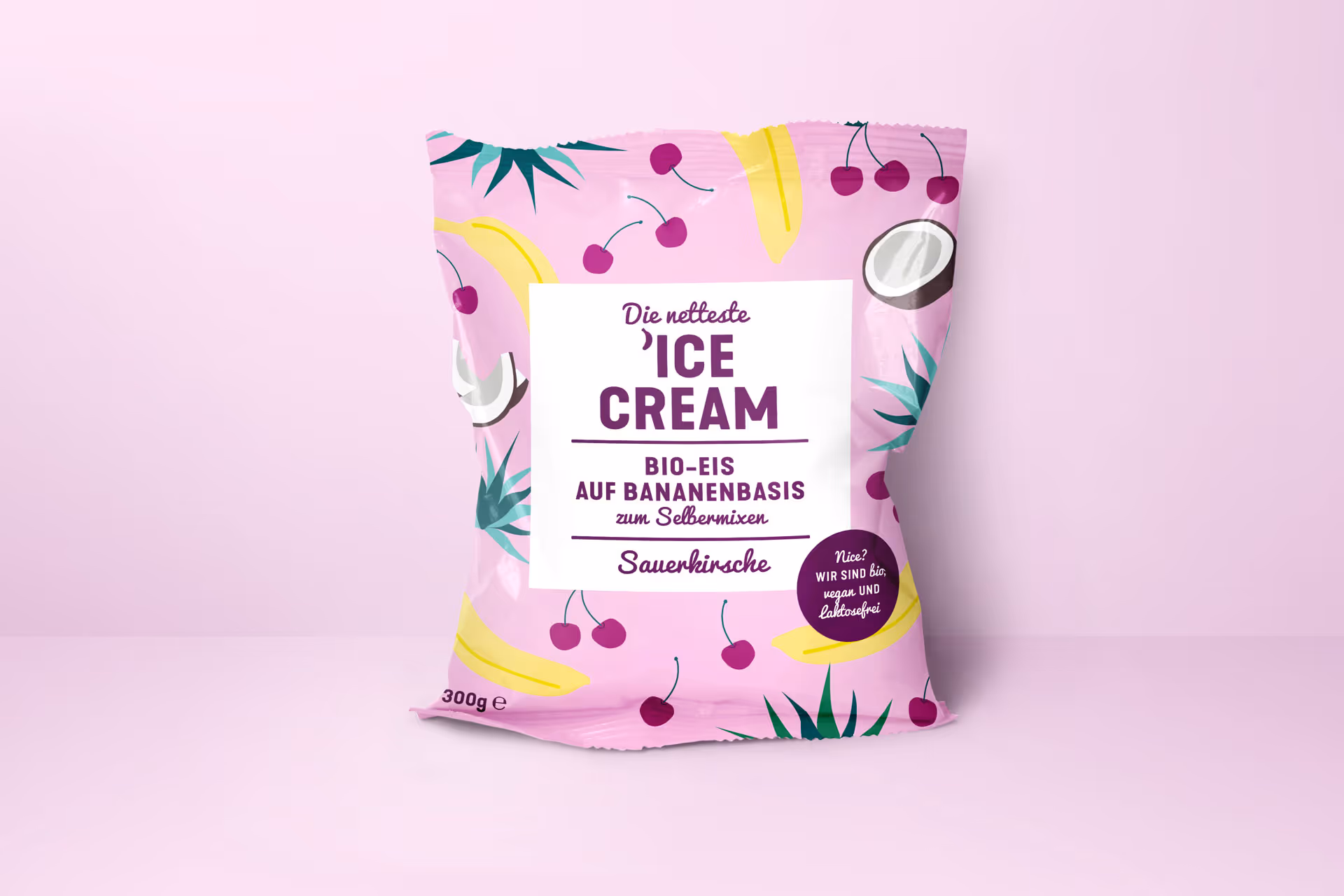 Die netteste ’IceCream – the world’s nicest bio-ice cream, where the content resembles the package. The product explains itself at first glance: the design emphasizes the text and the abstracted illustrations of the respective ingredients. The depiction of the contents underlines the niceness of the bio-product, while pleasant pastel colors get you in the mood for summer, leisure and – of course – ice cream.