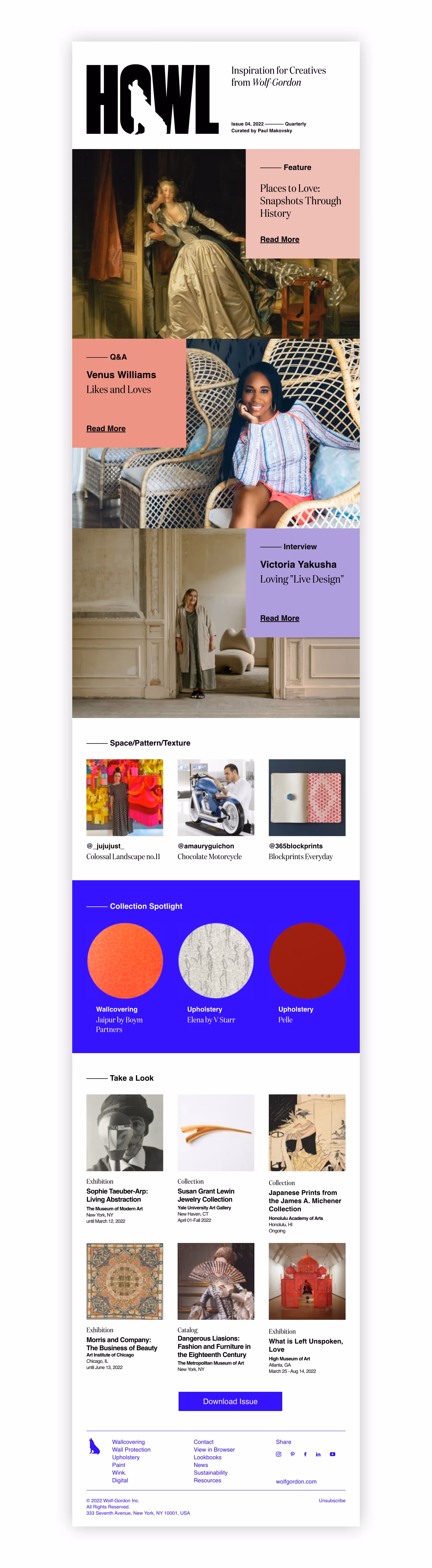 HOWL is a digital quarterly publication by Wolf Gordon dedicated to explore the role of inspiration in the creative process. Each issue is curated by design journalist Paul Makovsky and features articles aimed to inspire interior designers and other creatives.